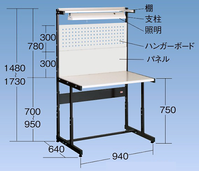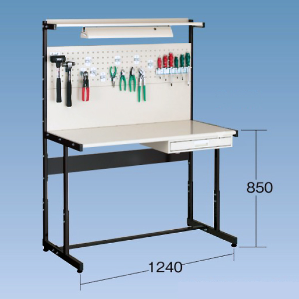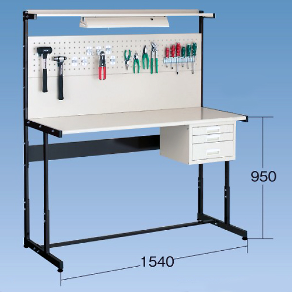 セル生産作業台としてお使い頂けます。 テーブルの高さは700~950mmまで50mmピッチで調節ができます。(天板はスチール製) ●高さ調整式 (50mmピッチで調節ができます) 作業者や作業内によって高さが調節でき、とても便利です。 |