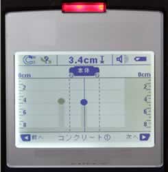 | ■特長 ●操作はカンタン、誰が使っても正確な探知が可能 ●探知結果は一目瞭然。大型液晶ディスプレー採用、日本語表示 ●暗所での作業に便利、液晶バックライト(照度調整可能) ●最大探知深さ150mm 1. 一歩先を行くテクノロジーで作業効率、安全性が大幅アップ ●鉄筋・非鉄金属・塩ビパイプ・CD管・電線・木材まで探知可能! 最大探知深さ150mmで、対象物までの深さ、材質をズバリ表示! 2. 材料によって選べる7つの探知モード ●コンクリート(1)モード(最大探知深さ80mm) レンガやコンクリートの中の対象物を探知します。 ●コンクリート(2)モード(最大探知深さ150mm) コンクリートの中の対象物を探知します。 ●湿ったコンクリートモード(最大探知深さ60mm) 乾いていないコンクリートの中の対象物を探知します。 ●配管式床暖房配管モード(最大探知深さ80mm) 鉄筋、電気配線、金属、水の入ったプラスチック管を探知します。 ●石膏ボードモード(最大探知深さ80mm) 木や石膏ボードで、木材、金属、電気配線などを探知します。 ●金属モード(最大探知深さ60mm) 金属対象物や通電した電線を探知するのに向いてます。 ●ダイレクトモード(最大探知深さ150mm) 探知対象物の全てが、探知信号の強度で表示されます。 3. 自分好み、に使いやすくカスタマイズ可能( )内は工場出荷時設定 ●表示言語設定:日本語・英語(日本語) ●自動スイッチオフ:1、2、5、10分、設定しない(5分) ●バックライト点灯時間:10、20、30、60、120、240秒、常時点灯(30秒) ●バックライト照度:最大・中間・最小(最大) ●シグナル音の鳴る場面:対象物・通電線・ボタン操作(対象物) ■探知結果は一目瞭然