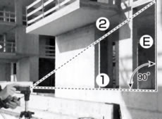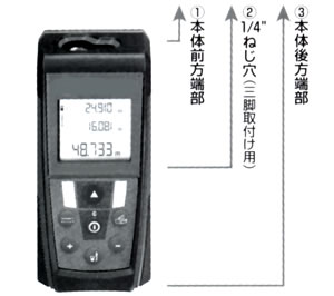 ■作業に応じて選べる5種類の測定モード ●ピタゴラス(辺測定)モード 直角三角形の二辺(1・2)を測ることにより、残りの一辺(E)を瞬時に知ることができます。 ![]() ●距離の測定 ●面積の測定 ●体積・容積の測定 ●連続測定 ■測定状況により3つの測定基準点を選択可能