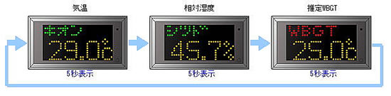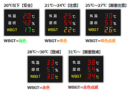 ■室内用 M507BGT-IM01Nの動作 WBGTの値によって表示色が変化し、「厳重注意」「厳重警戒」では点滅表示をします。 休憩時間や水分補給などの目安になり、熱中症を回避できます。 ![]() ■屋外用 M507BGT-S01Nの動作 気温、相対湿度、推定WBGTを5秒ごとに切替表示します。 ![]() ■WBGTとは・・・ WBGT指数とは、暑さ指数とも呼ばれています。 元々は軍隊で、熱中症予防のために提案された尺度として用いられていました。 現在ではスポーツや職場での熱中症などを予防するための指標として使用されています。 ISOにも規定されるなど、熱中症予防の世界的な基準として高い信頼を得ています。