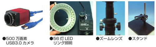 | ■特長 ●USB3.0接続 ●光学6倍比ズームレンズ搭載でトータル倍率23倍〜140倍(35倍〜210倍に変更できます。) ●目盛ごとにロックするラッチ機能付ズームレンズ(作業者による誤差がなくなるため計測に向いています) ●0.5倍補助レンズをご用意(オプション) ●作動距離90mm一定 ●解像度(フレームレート※)2592x1944(14fps)、1280x960(25fps) ※実際のフレームレートは、パソコンの性能、設定環境により異なります。 ■標準装備 ![]() ■標準装備の簡易計測ソフトの機能(CD-ROM)
