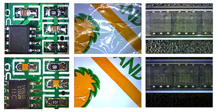 LEDリング照明を使用し観察すると(左の写真)ハンダ部や金属端子部で表面反射やハレーションが起こり観察することが困難です。 ハレーション除去マイクロスコープで観察すると(右の写真)、Wフィルターによって表面反射やハレーションを大幅に軽減できます。 ●ビニールの表面 LEDリング照明を使用し観察すると(左の写真)、ビニールの表面部でハレーションが起こり観察することが困難です。 ハレーション除去マイクロスコープで観察すると(右の写真)、Wフィルターによって表面反射やハレーションを大幅に軽減され、模様のエッジ部分まで観察できるようになりました。 ●保存スティック内のICチップ ハレーション除去マイクロスコープで観察すると通常のLEDリング照明で観察した左の写真では見えなかった、保存スティック内のICチップ上の印字や足番号認識のためのくぼみが確認できるようになりました。 ■標準付属ソフト(CD-ROM)