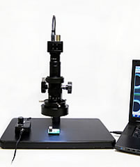 ●通常の落射式リング照明がついたマイクロスコープでよく起こる光の反射・ハレーション(白とび)を大幅に抑制、軽減、反射除去するマイクロスコープです。 ●偏光フィルターをレンズ先端と照明の両方に取り付け、光の表面反射やハレーションを軽減させます。(反射除去) ●任意の2点間距離測定が可能。 倍率は20倍-120倍の連続可変です。 (無償で30倍-180倍に変更することもできます) |