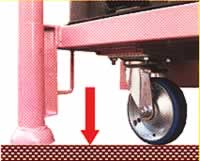 | ■台車として・・・ 4本ポストの内2本が着脱式です。 取り外したポストの収納もできます。 150φキャスターの採用により 500Kgまで移動可能です。 ![]() ![]() ■ラックとして・・・ 上下可動式キャスター(スルーラック機構)搭載により200kg積載すると、GLと接します。 ・1,000Kg/P×2段 ・外寸法 : 1.370×1.370×1.370 (H) ・有 効 : 1.100×1.100パレット対応 ■ラックと台車の切替機構 ●切替機構を”ON”するとスルーラック機構がロックされ台車(カート)として荷の搬送ができます。 ●切替機構を”OFF”するとスルーラック機構が有効となり積載荷重により、ラック自体が沈み込み保管ラックとして機 能します。 ![]() ■1,000kg/P*2段 ![]() |