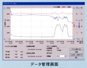 | ■空気環境計測に最適な4つの理由 ●高精度なCO2センサを搭載し、測定精度±5%を実現 ●二酸化炭素濃度と同時に温度・湿度を測定 ●様々な状況に対応する電池・ACアダプタの2電源方式 ●取得データをグラフ化してトレンドを把握※オプション(データ収集ソフト) ■メモリ機能搭載(最大で約5ヶ月間連続記録可能)※15分間隔時 ■専用アプリケーションとの通信により多彩なデータ解析を実現! ●リアルタイムにデータ推移を確認しながら計測可能 ●ポータブル計測で記録したメモリデータを表示 ●最大8台のモニター機を同時モニタリング可能 ●換気回数計算機能も搭載