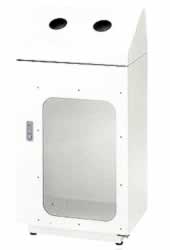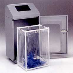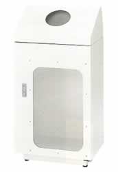 (防犯対策用)窓付タイプの特徴 懸念されるテロや犯罪、いたずらなどの対策用として、ドア部分に透明窓を設けました。 中容器の代わりに透明な袋をセットする構造で、ドアを開けずに内部の状況が確認できます。 横面、後面にも窓を設けられます。お気軽に御相談ください。 |