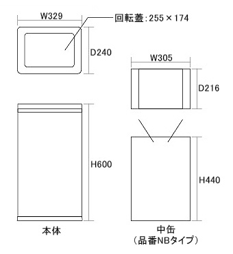 ■特徴 ●ステンレス製で回転式のロータリー蓋仕様。 ●袋止め付(品番BBタイプ) バインダー式袋止め。本体内部にきれいに袋がおさまります。 ![]() ![]() ●中缶(品番NBタイプ) 材質:亜鉛メッキ鋼板(板厚:0.3) ![]() ■寸法図 ![]() ■材質