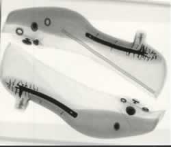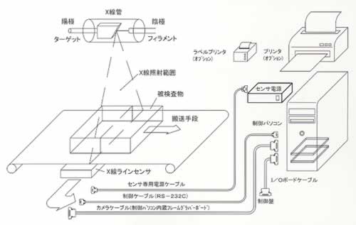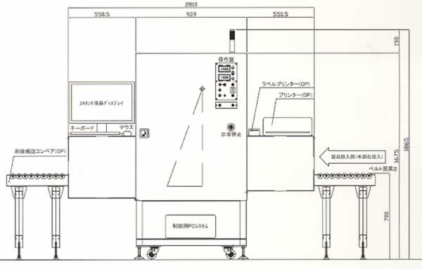 | ■省スペース ラインセンサの採用により、本体コンベアがコンパクトで、設置場所をとりません。 ■画像強調 画像表示により、異物を強調させ混入場所の特定が容易になり、検査処理時間を短縮できます。 ■保存活用 画像データと共に、製造年月日、番号、オーダーNO.等のデータを保存管理できます。 ※オプションのラベルプリンタで、製造年月日、オーダーNO.、製造番号の自動ラベル印刷が可能です。 ■X線の安全基準とは 作業者の安全に関しては、本装置は、X線を照射する装置であり、かつ、装置外部への漏れ線量は、1μSv/h以下の為、「電離放射線障害防止規則」に定められる3ヶ月で1.3mSv/h以下であり、管理区域の設定、作業主任者の選定は必要ありません。 (X線装置を使用する事業者は、装置設置工事の30日前までに、その計画を直轄する労働基準監督署署長へ、届け出る必要があります。) ■鉛板による防護 装置のX線漏洩の基本は、装置内部に貼られた鉛板により行います。 ■鉛含有カーテンによる防護 装置の出入り口は、鉛含有のカーテンにより行います。 1枚は鉛当量=0.25mmPbで3枚以上設置すます。 ■インターロック機構 肩部分・開口部には、すばやくX線の遮断を行う機構を設置しています。 また検査物が装置内で渋滞した場合も、X線の遮断を行い、過度なX線照射を防ぎます。 (コンベア出入口に手などを入れた場合、安全の為、X線照射、コンベア回転が自動停止します。) ■撮影能力 靴の底の釘以外に異物(金属、ガラス、石、樹脂、硬質ゴム、シリカゲル等)も撮影する事が可能です。 ![]() ■1300mmまで対応 ロングブーツ、コートも1枚の画像としてディスプレイ上での検査が可能です。 ![]() ■画像拡大・縮小 表示画面を拡大及び、縮小することができます。 画像の表示倍率を0.4倍〜4.0倍まで0.1倍ステップで設定できます。 ![]() ![]() ■検査角度変更機能 ワンタッチにて、検査角度を0度から20度への切換えが可能です。 この機能により、X線撮影検査時の死角を減少することができます。 ![]() ■画像印刷 オプションのカラーインクジェットプリンタを接続することで、リアルタイムで、画像を印刷することが可能です。 ![]() ■検査能力 ラインセンサ方式により、ワークを止めずに(画像は静止)1日当たり6000足(実績)の検査が可能です。 ![]() ■自動検針機能 オプションの自動検査機能ソフトでアパレルの中の折れ針を自動で検出し、マーキングすることが可能です。 詳細は、別紙オプションをご参照下さい。 ![]() ■装置構成 ![]() ■検査範囲 ![]() ■装置寸法 ![]() ![]() ■仕様