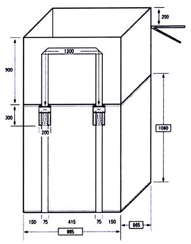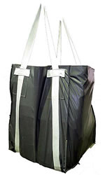 ●繰返し使用可能で、燃えにくい素材で作られた耐熱温度250℃のフレコンバッグ。 ●投入口に「きんちゃく有」と「きんちゃく無」の2種類があります。(左図はきんちゃく有タイプ) |