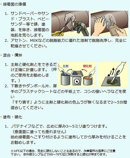 | ■特長 ●溶接技術等の特別な技能を必要とせず、漏えいの原因となる金属の補修が出来る。 ●火を使わずに金属の穴埋め、接着、シール、肉盛りが出来る。 ●パテ状で、垂直面に肉盛りをしても垂れない。 ●鉱物油、ガソリン、水に対して優秀な耐性を有し、特にアルカリに対して優れた耐性を有する。 ●金属全般、木材、コンクリート、石材に対し接着力が強い。 ●異種金属の補修や接着を行っても電蝕を起こさない。 ●硬化後は、各種ハンド&機械加工が可能 ●鉄粉配合。 ●主剤・硬化剤は、長期保存が可能。 ■用途 ●配管、バルブ、タンクなどの修理 ●鋳物の穴埋め、肉盛り修正、巣埋め ●冶具、保持具の製作 ●金属材質設備機器の肉盛り、穴埋め等 ■使用方法 ![]() ■使用例 ![]() 配管やタンクなどの液漏れ補修に。 ■使用効果 ![]() 新品に交換することなく再生することでコストダウンができます。 ■仕様
