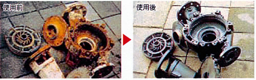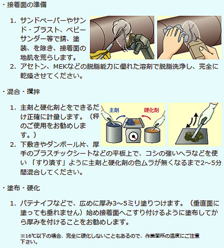 | ■特長 ●鉄粉配合。 ●通常製品の10倍以上の速さで硬化する超速硬化タイプ。 ●-18℃の雰囲気温度下でも、24時間で硬化。 ●容積比率が等量配合で簡便。 ●金属全般、木材、コンクリート、石材に対し接着力が強い。 ●異種金属の補修や接着を行っても電蝕を起こさない。 ■用途 ●パイプライン、タンクの緊急修理 ●加工中の鋳物のす埋めや肉盛り ●滲み~滴下状態の水漏れ補修 ●金属材質設備機器の肉盛り、穴埋め等 ■使用方法 ![]() ■使用例 ![]() 配管やタンクなどの液漏れ補修に。 ■使用効果 ![]() 新品に交換することなく再生することでコストダウンができます。 ■仕様