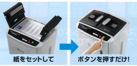 紙をセットして、ボタンを押すだけでA4コピー用紙最大150枚まで細断できます。 ボタンを押したらその場を離れても自動で細断して自動停止するのでその場で待つ手間が省けます。 |
