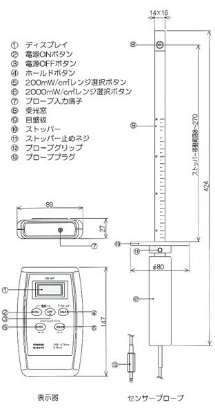 | ■本機の最大の特徴 1.印刷乾燥不良を撲滅 高速印刷機で使用されている高容量乾燥用ランプの点灯照度を、直に測定、監視できますので、印刷不良の撲滅に寄与します。 2.十分な耐熱性 ランプ直下の熱は300℃以上の高温になっていますが、本機は十分な耐熱性を有しますので、安全に測定できます。 ■こんな所に気配り 1.センサープローブには、目盛付きで、ストッパーを固定することにより、常に同じ位置で測定ができます。 2.自動0調整機能が付いていますので、電源スイッチONですぐに測定が始められます。 3.測定値を正確に読み取るために、データホールド機能付きです。 4.電池の消耗を防ぐため、約3分で自動的に電源がOFFします。 ■外形寸法及び各部の名称 ![]() ■仕様