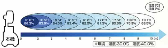| ■特長 ●風量は、3段階の調節が可能です。 ●高さ調節ができます。 ●無風状態の推測距離約10m ●渇水停止首振り機能付き ●1点吊フック付 ●水道直結可能 ●ラインストレーナー2個を搭載。 さらに高圧ポンプ内、高圧吐出側、ノズルにもフィルターを取付けて、従来品よりノズル目詰まりによるトラブルを低減。 ■飛距離及び冷却温度測定 ![]() ■仕様