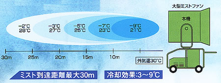 ミスト到達飛距離最大30mのハイパワーモデル 35個のミストノズルと大型ファンで広範囲のミスト噴射が可能です。 |