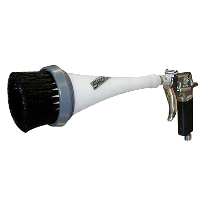 セミドライ洗浄では水を入れたバケツ等にブラシを浸し、トリガーを引いて適度に水分を飛ばしてから対象物を洗浄します。