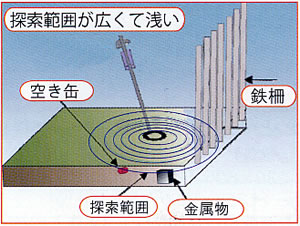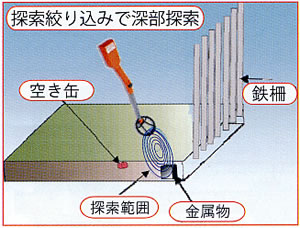 | ■特徴 ●自動感度調節機能の搭載で取り扱いが極めて容易です。 ●長時間作業も楽々こなせる持ちやすい小型軽量設計。 ●周辺金属の影響を避けた探索範囲の絞り込みが可能。 ■探索イメージ