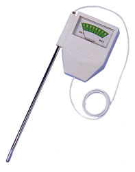 | ■特長 ●土壌の乾燥状態が一目でわかります。 ●電池不要です。 ■使用方法 ![]() ■メータ表示 メーターの目盛は1~8までの数字で表します。 植物ごとの適正値は下の表のとおりです。 <作物別適正水分表>