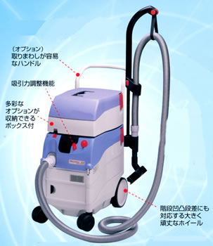 ●HEPAフィルター装着可能 (0.3μm微粒子を99.9%以上捕集) ●連続運転可能 200V機並みの吸引力 ブロア機能付 水位感知機能搭載 (通電性のある液体を感知) |
