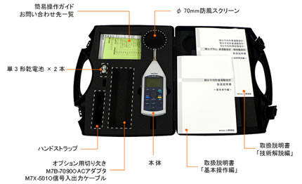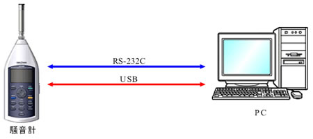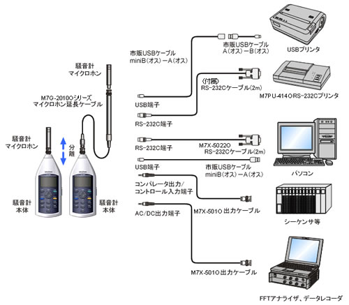 ●騒音計のマイクロホン部と本体部を切り離し、専用の同軸ケーブルで長距離延長可能 騒音計のマイクロホン部と本体部を切り離し、専用の同軸ケーブルを使用して、長距離延長する事が出来ます。それにより、遠隔での測定を簡単に実現する事が出来ます。 ●簡単手軽にデータ処理 騒音計本体をRS-232CまたはUSBケーブルでWindowsパソコンと接続し、専用フリーソフトを使用して、取得した計測データを素早く・簡単にパソコンへデータ転送したり、パソコンから騒音計を遠隔操作・制御する事が可能です。(M7A-1410Oは除く) ![]() ■接続構成例 ![]() ※M7A-1410OはUSB接続およびRS-232C接続は出来ません ■付属品