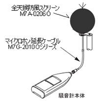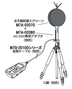 ●全天候型防風スクリーン 全天候型防風スクリーンを使用する事で、屋外での騒音測定時に風による雑音の軽減、雨や雪などによるマイクロホンの損傷を防ぐ事が出来ます。 ●騒音計用三脚 M7A-1410O/1440O/4440O用標準三脚です。最低高さはセンターポールを逆向きに付けることで、10cm以下にすることも可能です。