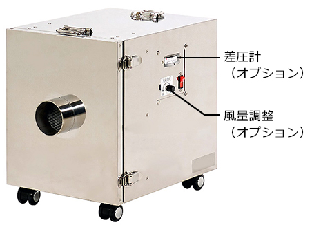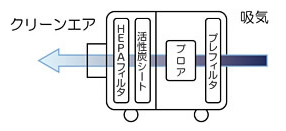 外部エアーをブロアで吸引し、高性能(HEPA)フィルタを通じてクリーンエアを対象空間などに供給する装置です。 循環使用も可能。 |