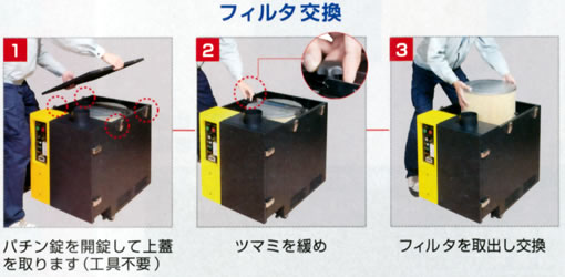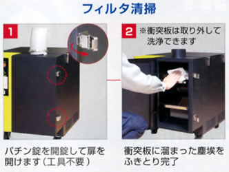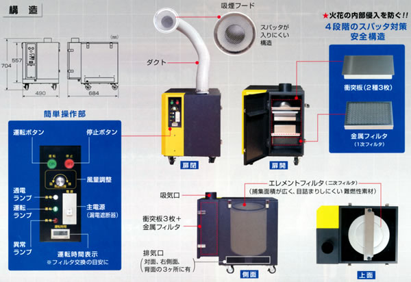 | ■特長 ●多重の安全構造 4段階のスパッタ対策(3枚の衝突板+金属フィルタ)で安全構造です。 溶接で発生する火粉を吸引した際、火災の原因となる火花を、内部に侵入しにくい仕組みになっています。 ●清掃がとても簡単 最も汚れが付着する衝突板のふきとり作業や取り外し洗浄は、扉を開くだけで行えます。 ※フィルタ交換も工具不要 ![]() ●コンパクトで移動もらくらく 〈W490×D684×H740mm〉とコンパクトサイズで移動も簡単。 設置場所を選びません。 ※省スペースのため作業台の下にも収納可能 ![]() ●高い捕集率 高い捕集率(0.3μm63.2%)と補修面積が広い(15㎡)難燃性のフィルタを採用。 ※目詰まりしにくいエレメントフィルタ ![]() ●AC100V仕様 単相AC100V仕様のため、電源確保が容易です。 ●ダクト口が増やせます オプションで、ダクト口が2分岐にできます。 ※1台で2ヶ所 同時に使用できM812SC-W12K、M812SC-W13Kの両機種に取り付け可能 ![]() ■構造 ![]() ■とっても簡単!メンテナンス ![]() ![]() ■仕様