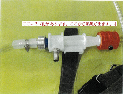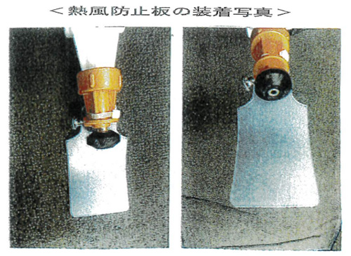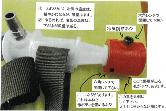 ■M826CL-SJ改良点 ①以前は、ホットエアシールド(熱風防止板) を付けて、販売しておりましたが、これは、それが要りません。 ②黒バルブが、風圧ではずれる事がありました。その心配もありません。 ![]() ボディは、材質が、 柔らかいので、 軽く六角レンチで、 回して下さい。 力いっぱい回すと 壊れやすいです。 ●改良型赤ボディ ![]() ●従来品 ![]() ●従来の赤ボディ ![]() ■M826CL-SJに装着の熱風防止板 (オプション品)/品番 M826CL-SJP1 ![]() 「M826CL-SJ」は、コンプレッサーから供給されるエアーを冷風と温風に分離して上部からは冷風を装着者に、下部からは熱風を 外気に放出します。 コンプレッサーからのエアー温度が高かったり、上半身に供給する冷風温度 を極端に下げた場合は、下から排出する熱風温度は60℃以上に達する ことがあり、装着者の腰部にこの熱い風が当たれば「熱い!」です。 ご紹介する「熱風防止板」は、その熱風が直接、身体下部に当たらないで 反射放散するようにするもので、別売りしています。 もし、「M826CL-SJ」を購入される時にこの熱風防止板付きを望まれる場合は追加¥500で装着した上、納品させて頂きます。 (既に「M826CL-SJ」をお使いの方で、この部品を自分で装着されたい場合は、600円プラス送料でお送りいたします。) |