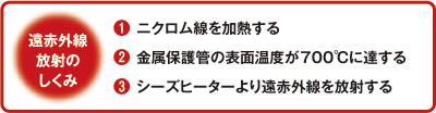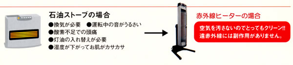 ●安全な機能 ・床置きタイプ全機種に転倒安全スイッチ標準装備。 万が一の転倒時に、自動でスイッチが切れる安全スイッチを装備しています。 ・視認性の高いパイロットランプで消し忘れ防止。 ![]() ●便利な機能 ・照射方向は自由自在 照射部分は左右に微調節が可能です。