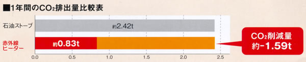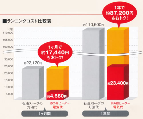 ・ハンドルとローラーで移動もスムーズ 本体に付属のハンドルとローラーで、持ち運びは、簡単ラクラク。 ![]() ■遠赤外線が体を直接あたためる経済的で効率的なスポット暖房です。 ●遠赤外線ヒーターは一般的な電気ストーブ(※)に較べ体の中から暖まります。(※近赤外線石英管ヒーター使用) 遠赤外線、身体に吸収されると、体内の水分やタンパク質等の分子として共鳴して、熱エネルギーを生む働きがあります。 また、遠赤外線は3~1000μmの波長を持つ電磁波の一種であり、金属を除くほとんどすべての物質と波長が一致するため、近赤外線・中赤外線よりも対象を内部から暖めることができます。 赤外線ヒーターでは遠赤外線のこの特性を生かして“より暖かい”を実現しています。 ●経済的でエコロジー。石油ストーブよりこんなに“お得”です! 石油ストーブなどで、工場・倉庫などの大空間を暖房するには、作業人数に関係なく、空間全体を暖める必要があります。 スポット暖房「赤外線ヒーター」なら、必要な場所だけを効率よく暖めますので、エネルギーの消費低減に高く貢献します。 赤外線ヒーターの電気代は、石油ストーブの灯油代に較べ1台あたり1年間で「約8万円」お得です! (作業者1人1台使用した場合の試算) ![]() ●赤外線ヒーターは、電気式暖房器具だから空気を汚しません。 ![]() ●石油ストーブに較べ、年間約1.59t(推定)のCO2排出を削減します。環境対応への取り組みに貢献します。 ![]() ■タイプ ![]() ■仕様