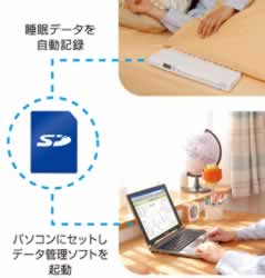 | ■特長 ●測定者に負担をかけないセンサーマット ・敷布団やマットの下にセンサーマットを敷くだけ、センサーを身に付ける必要がありません。 ・敷布団やマットの厚さは20cmまで測定可能 ・センサー感度調節機能付き ●簡単測定 ・SDメモリーカードに測定結果を自動記録 ・最短1時間から最長24時間まで測定可能 ●パソコンで測定結果を確認 ・専用データ管理ソフトでわかりやすく表示します。 ・プリントアウトも可能 ![]() ■睡眠計とは・・・ 睡眠の状態を簡便に観察できる画期的な機器です。 センサーマットで感知した睡眠中の呼吸、脈拍、体動による振動をもとに睡眠の深さを表示します。 深い睡眠がとれているか否かは、睡眠の評価において重要なポイントです。 また、深い睡眠の割合や寝付き時間、途中の目覚め回数などの情報から睡眠の総合評価を表す指標「睡眠点数」を表 示します。 SL-501で測定することによって睡眠の状態やその傾向を把握し、日々の生活習慣や体調を照らし合わせることで 健康管理にお役立てください。 ![]() ■用途 ●睡眠状態が気になる方へ ●ホテルや旅館のサービス向上に ●睡眠外来でのスクリー二ングに ●社員・職員の健康管理に ■使用方法 ●測定前の準備 1. SDメモリーカードをセットします。 2. ACアダプターを接続します。 3. 日付・時刻を設定します。※初回のみ 4. センサーマットを設置します。 5. センサーマットの感度調整をします。 ※初回及び寝具を変更したときや使用者が変わったときに必要です。 ●測定の仕方 1. 測定を開始するときは、[START/STOP]ボタンを押します。約10秒後に測定が開始されます。 2. 測定終了は、起床したら[START/STOP]ボタンを3秒間長押ししてください。 ●記録の見かた 1. SDメモリーカードをパソコンにセットします。 2. 専用データ管理ソフトを起動します。※事前にインストールしてください。 3. ユーザーを選択します。 ユーザーは4人まで登録でき、パスワード設定も可能です。 4. 睡眠データ解析をします。 SDメモリーカードに記録されたデータを取り込みます。 5. 結果表示を確認します。