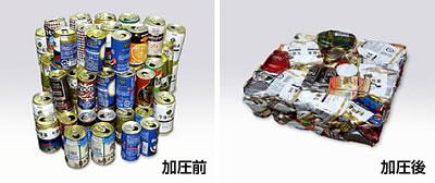 様々な形状の空缶を一度に短時間で圧縮・減容します。