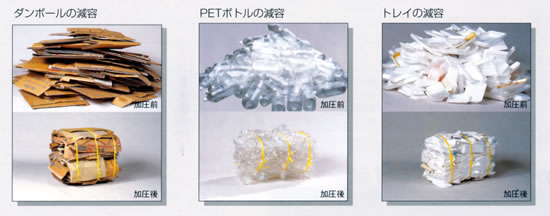 ダンボールやPETボトル・トレイ・ビニール包装材など分別された資源ゴミを圧縮・減容し、回収を促進します。 |