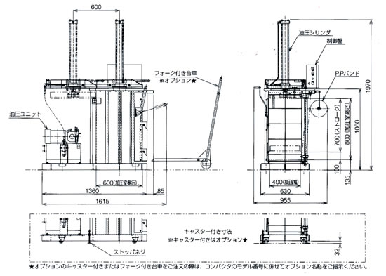 | ■特長 ●上部投入式なので作業が容易。 ●圧縮物はPPバンドで結束(側面3系統)してから前扉を開けて取り出します。 ●圧縮方法は油圧直押形なので強力かつスムーズ、しかも運転音は静か。 ●動作中に扉を開くと瞬時に停止する安全機構付き。 ![]() ■外形寸法図 ![]() ■仕様