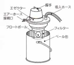 | ■特長 ●コンプレッサーエアのみを使用し、電気や回転部が無いので発火の心配がありません。 ●ペール缶がそのまま回収タンクになりますので予備のペール缶をご用意頂ければ、効率的に大容量の吸引が可能です。 ■本体標準付属品 ●静電、耐油2mサクションホースφ32、延長管、チューブノズル、クレビスノズル(スキマノズル)、PPラウンドブラシノズル ![]() ■各部名称 ![]() ■仕様