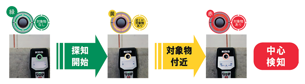 ※探知深さは対象物の材質および大きさ、探知面の材質により異なります。 ※通電していない電線は金属モードで探知が可能です。 ※探知環境によっては正確な探知ができない可能性があります。 ※壁材(モルタル)に金属が含まれていると正確に探知できません。 |