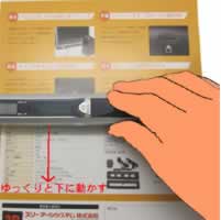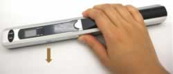 ■底面は継ぎ目のないデザイン、原稿がひっかかる心配がありません。 ![]() ■電源を入れる 電源/スキャンボタンを長押しして電源を入れます! ![]() ■モードを選択 スキャナ本体上のモード切替ボタン【C/BW】と解像度ボタン【DPI】を押して、 カラー[COLOR]/モノクロ[MONO]の選 択及び解像度(高画質[HIGH]/低画質[LOW])の選択を します。 ![]() ■簡単スキャニング スキャナ本体の電源/スキャンボタンを1回押して、スキャン LED が緑色に点灯していることを確認したら、スキャナ をゆっくりと下に動かします。 ![]() ■最後までスキャンし終わったら、そのまま動きを止めるか、電源/スキャンボタンを1回押せばスキャンが終了し、 保存を開始します。 液晶画面上のカウンタが増えれば保存完了です。 ![]() ■仕様