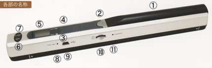 | ■簡単 電源をONにしたらボタン操作だけでスキャン可能。 スキャンする際にパソコンの操作は一切なく、どなたでもお使い頂けます。 ![]() ■軽量 電池をセットしても約210gの軽量サイズ。 A4サイズのビジネスバッグに収まり、持ち運びも苦になりません。 ■手軽 乾電池駆動なので外出先で電池が消耗しても交換すればすぐに使用可能です。 また使用に関して面倒なソフトやドライバのインストールは必要ありません。 ■各部の名称 ![]()