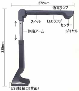 ■A3タイプ対応のスタンドスキャナ 今までA4タイプが主流だったスタンドスキャナですが今回、A3タイプまで使用可能となりました。 図書館や学校、会議の場や税理士さんなど様々なケースでご使用頂けます。 ■コンパクトボディで持ち運びにも便利 前機種よりサイズもコンパクトになり持ち運びも楽になりました。 PDF機能やOCR機能も搭載してますのでユーザー様の強い味方になること間違いなしです。 ■厚みのある辞書や立体物も簡単スキャン 焦点調整ダイヤル付きでA3サイズもキレイにスキャン 今までのフラットヘッドスキャナでは、スキャンが難しい厚みのある辞書や雑誌などの立体物もスキャン可能 スキャンしたい物を所定の位置に置き、撮影ボタンを押すだけでスキャン完了。 接続したパソコンでスキャン画像を見ながら操作できます。 ![]() ■焦点調整機能 A3サイズ撮影時にスキャンのアームの高さを変更する必要があります。 高さ(焦点)が変わる為、ピントがずれやすくなりますが、焦点調整ダイヤルによりピント調整ができる機能を搭載しまし た。 ■たたんでまるめてコンパクト収納 ●原稿の位置を合わせるマット ●上から撮影するスキャン本体で構成されています。 本体は電気スタンドのように折りたたむ事ができ、マットは柔らかい素材なので、丸めて収納することができます。 ![]() ■省スペーススキャナ時代の到来 コンパクトな設計のため、フラットスキャナに比べ、スパースを占領することがありません。 ■連続スキャン可能 設定枚数/設定秒数による連続スキャン 自動連続スキャン機能搭載 設定枚数や設定秒数になるまで自動で連続スキャンを行うため、ボタンを押さずに自動でスキャンできます。 また、フラットヘッドスキャナと違い、カバーの開け閉めの必要がないため、連続スキャンも楽に行えます。 デスクの上の資料の山をスキャンして、デスクをスッキリ整えませんか? ■白色LED、500万画素CMOSセンサー搭載 内蔵のLEDはタッチセンサーライト式。 USBケーブルが接続された状態で、スイッチ部分の電球のマークに触れると、LEDが点灯します。 撮影対象を明るく照らし、周辺が暗い環境でも撮影が可能。 ![]() ■各部名称と機能