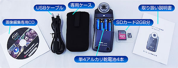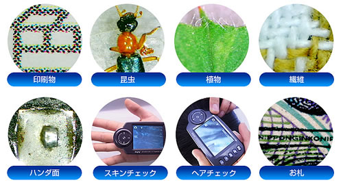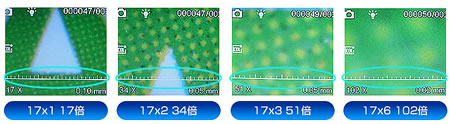 | ■特長 ●いろいろな用途に使用する事が出来ます。また写真撮影だけでなくムービー撮影も可能です。 金属面加工の確認や繊維の形状確認、印刷状態の確認など品質管理。学校・研究所などでの昆虫・直物の観察。美容業界のヘアチェック、病院でのスキンチェックなど様々な用途のプロとして活躍します。 ムービー撮影も可能ですので、動きのある物の撮影も可能です。観察物接写の場合、およそ10倍と17倍で焦点が合うように設計されていおります。 ![]() ●大きな画面で倍率ダイヤルでのピント調整もラクラク コンパクトなのに2.7インチと大きな液晶画面で、ピントの調整もずれにくく簡単に調整できます。 ●倍率ダイヤルは光学10倍、17倍。デジタルズームは最大30倍まで設定可能。 ![]() ●目安としてスケールが液晶画面に表示されます。(下記のように目安として液晶画面にスケールが表示されますのでルーペとして使えます。) ![]() ●LEDライトで明るくきれいに撮影 LEDライトを内蔵。しかも4段階調整できるので被写体にあわせて美しく撮影する事が可能です。 ![]() ●撮影データに特殊効果をかけられます。 セピア、白黒、ネガ(反転)などの特殊効果をかけることができ、一部の対象物に適したせって2変更できます。 ●乾電池式で専用ケース付きなので、手軽に持ち運びが可能 電池式なので外出時にも取り換えが可能。またやわらかいクッション性のある専用ケースが付いていますので、持ち運びの心配はいりません。(アルカリ乾電池、並びに専用ケースは付属品です。) ●パソコンと接続して簡単転送 付属のUSBケーブルでパソコンと接続するだけで画像転送が可能です。ソフトのインストールは不要です。 ![]() ■付属品 すぐにでもお使いいただけるようUSBケーブル、SDカード(2GB分)、単4アルカリ乾電池4本、専用ケース、取扱説明書、画像編集専用CD、使用時に必要なもの全て完備しておりますので、安心してお買い求めいただけます。 ※付属CDは画像を編集・管理が簡単にできるソフトです。専用ソフトをインストールすれば、測定などに使用する事が可能です。ただ撮影して見て保存するだけならソフトのインストールは不要です。 ![]() ■仕様