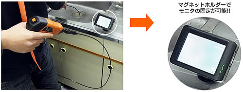 2.4GHzフレキシブルスコープは、ワイヤレスでモニタへ映像を表示できます。狭い・細い・暗い・届かないなど、これまで目視での確認が困難であった場所もしっかり確認できます。モニタとスコープをそれぞれ使用できるため、高い所も狭い隙間でも楽な体制で作業することが可能です。 |
