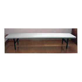 | ■特長 ●床机(文机)の座卓テーブル ●足はフレームの内側に折畳んで収納され、ゴムクッションが1足に2ヶ、計8ヶ付いています。 ゴムクッションも取れにくく、仮に1つ取れても傾くことがないので面倒な面合せで積上げる必要はありません。 ●天面は少々の衝撃では凹みません。 ●天板周囲はゴム巻で角当てに強く、画鋲をさすこともできます。 ●対雨性も一般市販品よりはるかに優れています。 ●開閉作業はすこぶる迅速・簡単