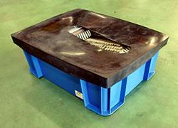 ●場内に入る際に踏み込むと、長靴の底を人工芝で洗い、消毒液で長靴の消毒を行います。(ただし足首より下部のみ)。ゴム内面のヒダ部で消毒を促進。 ●靴底は容器底に沈めた人工芝を踏み付けて洗います。(靴を往復運動します。) |