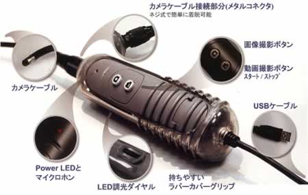 静止画・動画録画機能付き 肉眼では見難い暗い細部や深部をモニター&録画できる便利なツールです。先端にLEDが付いた細径のカメラケーブルを挿入し、観察できます。パソコンに直接USBで接続する工業用ビデオスコープ(内視鏡)です。 |
