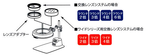| ■特長 ●光源は基板型LEDを笠内に配し、フラットな拡散保護カバーにより配光特性を30W蛍光管と同等レベルに致しました。 ●LED照明は、電源スイッチにより簡単にON/OFFが可能です。(光量調整機能は有りません。) ●レンズアダプターを使用する事で、φ150mmのワイド交換レンズと、φ130mmのラウンドシリーズ交換レンズを共用する事が可能になります。 ■交換レンズ 交換レンズの倍率は下記8種類から選択、及び交換することができます。 レンズはディストーション(湾曲収差)を軽減させたレンズを採用し、ルーペと顕微鏡の中間値でユーティリティを重視しています。これにより、2倍から15倍まで、両眼で平易に拡大像を確認することが可能になりました。 交換レンズはこちらからご確認ください。 ![]() ■レンズの交換方法 レンズアダプターを使うことにより同じ本体にて交換レンズシステムに対応可能です。交換用レンズの詳細は上記をご確認ください。 ![]() ■タイプ