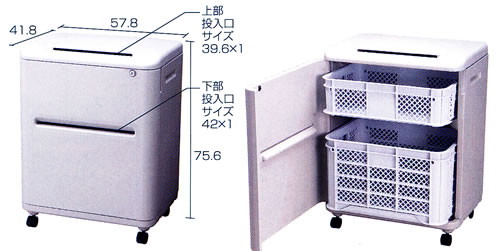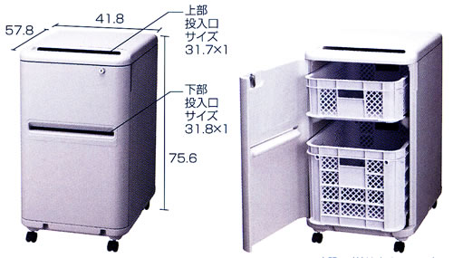 | ■特長 ●投入口を下向きに設計しているため、中が見えにくい構造になっています。 ●幅1cmの投入口。書類・CDのみが入り、手はな入らない構造なので機密性が保たれます。 ●全製品キーロックが可能で安心設計です。鍵は2本付いています。 ![]() ●機密キャビネットシリーズの許容荷重は50kgです。 ●ストッパー付きキャスター2個と、フリータイプのキャスター2個がセットになっており、移動がラクラク出来ます。 ●本体後部にワイヤー用のフックが付いているので、盗難防止に役立ちます。 ![]() ●ダンボールのフタが邪魔になりません。機密キャビネット1分別タイプはA3サイズの段ボールがスッキリ収納できます。 ![]() ■タイプ