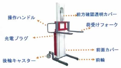 | ■透明カバーで前方確認可能 前面にカバー付きで安全 ![]() ■運搬しやすい幅広ハンドル ![]() ■充電器内蔵100V充電 ![]() ■フォークは前輪に被せることが可能 ![]() ■部分名称 ![]() ■寸法図 ![]() ![]() ![]() ![]() ■仕様