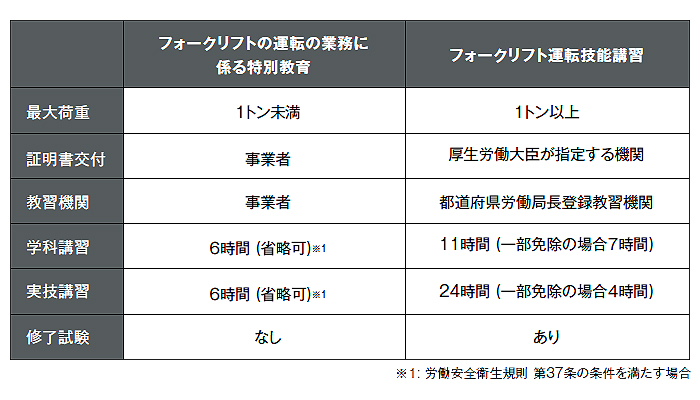 事業者は、最大荷重1t未満のフォークリフトの運転(道路上を走行させる運転を除く)を労働者に就かせるときは、 安全又は衛生のための特別教育をしなければならないことが義務付けられています。