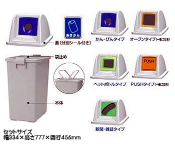 | ■特長 ●素材 再生できるポリプロピレン 耐衝撃性能に優れ、柔軟で軽量ポリプロピレンを素材にしています。ポリプロピレンはリサイクルが容易な素材として注文されています。 ●フタ 色で分別 ゴミの種類ごとに使い分けていますので分別がしやすく、とても便利です。 ●グリーン購入対応品 耐衝撃性能に優れ、また軽量なポリプロピレンを素材として使用しています。ポリプロピレンはリサイクルが容易な素材として注目されています。 ●回収、本体袋止め付 ポリ袋押えが便利 70リットル用ポリ袋がピッタリ入ります。ポリ袋押えがしっかりと押さえますから衛生的に回収できます。 ![]() ●投入口 ゴミの種類に合わせた投入口の形状 分別投棄にあわせ、投入口の形状を5タイプ用意しています。また、雨水が中に流れ込みゴミが漏れることのないよう投入口の角度を設定しています。投入口の形状がゴミの種類によって異なっているので他のゴミが入りにくくなっています。 ![]() ![]() ![]() ●セットサイズ ※本体とフタは別売りです。 ※シールはフタに1枚付属しています。 ![]() ■各種フタ