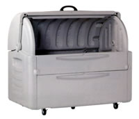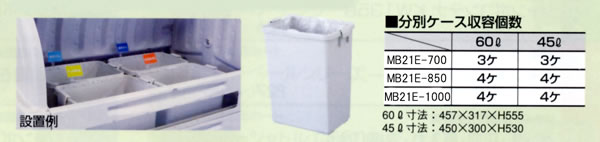 ■素材![]() ●柔軟なポリエチレン ポリエチレン製品は、弾力性に富み衝撃に強いのが特色。 汚れも水洗いすることで簡単に落とせます。 ●安全に配慮したカタチ 接触してもけがをしない様に丸くて優しいカタチにしています。 ■脚部 ![]() ●キャスター付(5ヶ付き) 移動が楽なキャスター付き(キャスター径75mm)があります。 キャスター付きはストッパーが付いていますから、風で吹き飛ばされることはありません。 (自在ブレーキキャスター2ヶ・自在キャスター3ヶ付いています。) ■背面 ![]() ●転倒防止用ボルト付 後部に転倒防止用ボルトが付いていますから、壁などにくさりを引っかけることができ、強風時も安心です。 ■底面 ![]() ●排水口付きで衛生的 排水口が付いていますので内部を水洗いした際に排水がスムーズに行えます。 ■扉 ![]() ●大型扉のスムーズな回転 片手で開閉もラクラク 回転式なので、開閉も軽くてスムーズです。 取っ手も付いていますので、簡単に開け閉めできます。 ■特長 ●ポリエチレン二重構造 衝撃に強い二重パネル構造。 大型容器に適した成型方法です。 ![]() ●取り出し口が大きくゴミの投入が簡単にできます。 ![]() ●上下2つの開閉扉でゴミの回収もラクに行えます。 上下の大型扉を全開にすることで、ゴミ回収をよりスムーズに行うことができます。 (MB21E-850、MB21E-1000) ![]() ■タイプ・寸法図